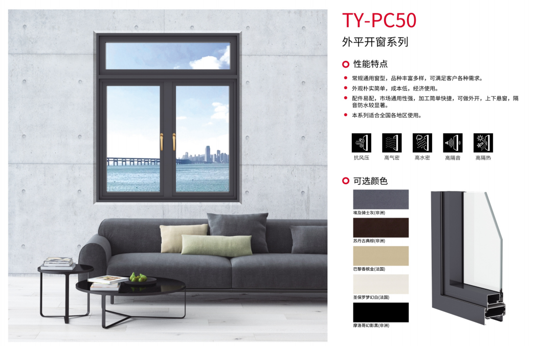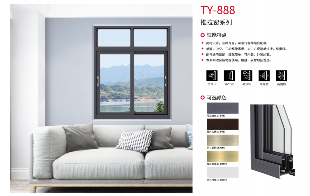 桃園鋁業(yè)一直在鋁型材和門窗產(chǎn)品領(lǐng)域精耕細(xì)作,發(fā)展至今,窗型新款實(shí)用、結(jié)構(gòu)簡單加工安裝方便,單玻雙玻全、防水、防風(fēng)、隔熱、防蚊、防盜等功能齊全,門窗體系高性能,抗風(fēng)壓性能、氣密性、水密性、隔音性能、保溫隔熱性能,無論哪個指標(biāo)都是杠杠滴。